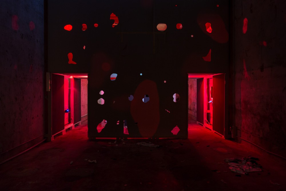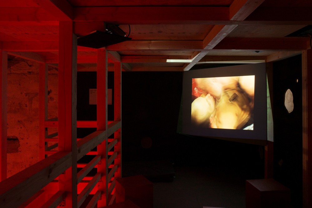 On opening night, hundreds of curious attendees made the trek on the vaporetto from the Giardini, where the official pavilions are located, to the far end of the island of Giudecca, where Cruising Pavilion was staged. Dimly lit with a red glow, the hosting arts venue Spazio Punch took on the ambience of a sex club with a previous exhibition’s mezzanines and narrow stairways further setting the mood and suggesting the possibility of clandestine encounters. As I made my way through the show, I became aware just how much exhibition design and cruising clubs have in common: both are essentially mazes that guide visitors though semi-secluded areas, allowing them to search for unexpected fulfillment through engagement with unknown entities, whether art or bodies. In this rare case, both were possible.