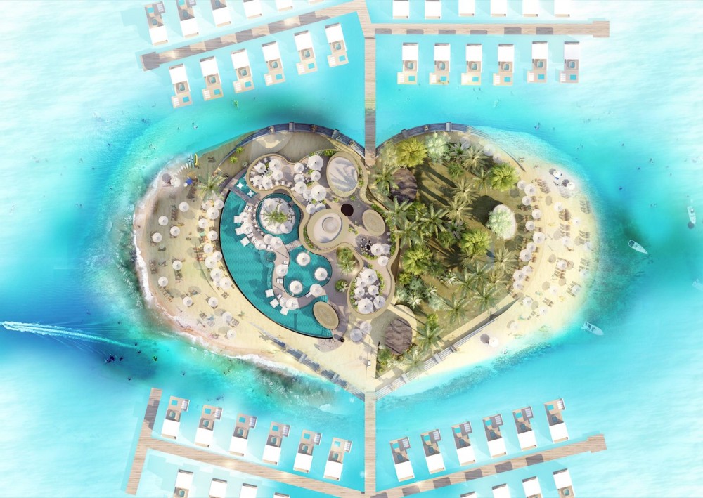 The effect, I imagine, is subconscious. The shape of the heart is suspended in your mind. Sitting in one of your private bungalows, staring out to sea, you find yourself in love again with your partner. You find yourself thinking, “This is love island.” With these bird’s-eye designs, the heart as an ideograph is reduced to an essence: a private seaside colony in an anonymous paradise. To see a heart is unsophisticated when instead you can live it. When two hearts come together, overwhelmed by blue, love does not need to announce itself. Love is within you. Love is atmospheric. Love is floating all around. Love is transfiguration.