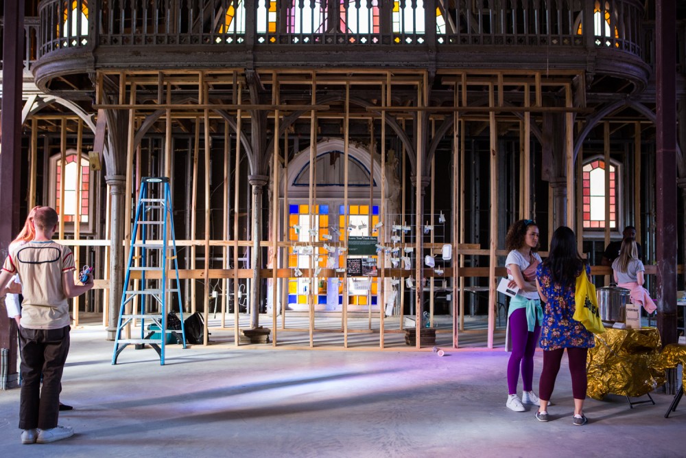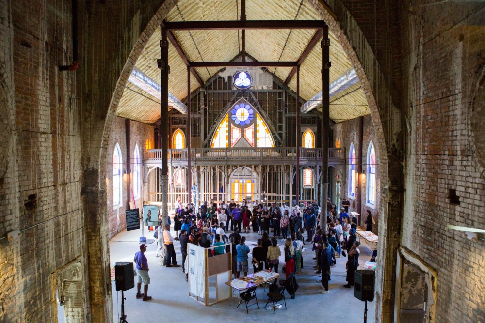 Visitors to IdeasCity gather in a hollowed-out 19th century church to view the work of the program's 20 fellows. Photograph by Sarrah Danziger for PIN–UP.