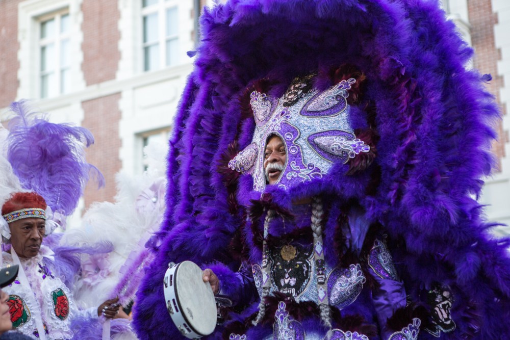 Big Chief David Montana performing on stage with other mambers of the Washitaw Nation. Photograph by Sarrah Danziger for PIN–UP.