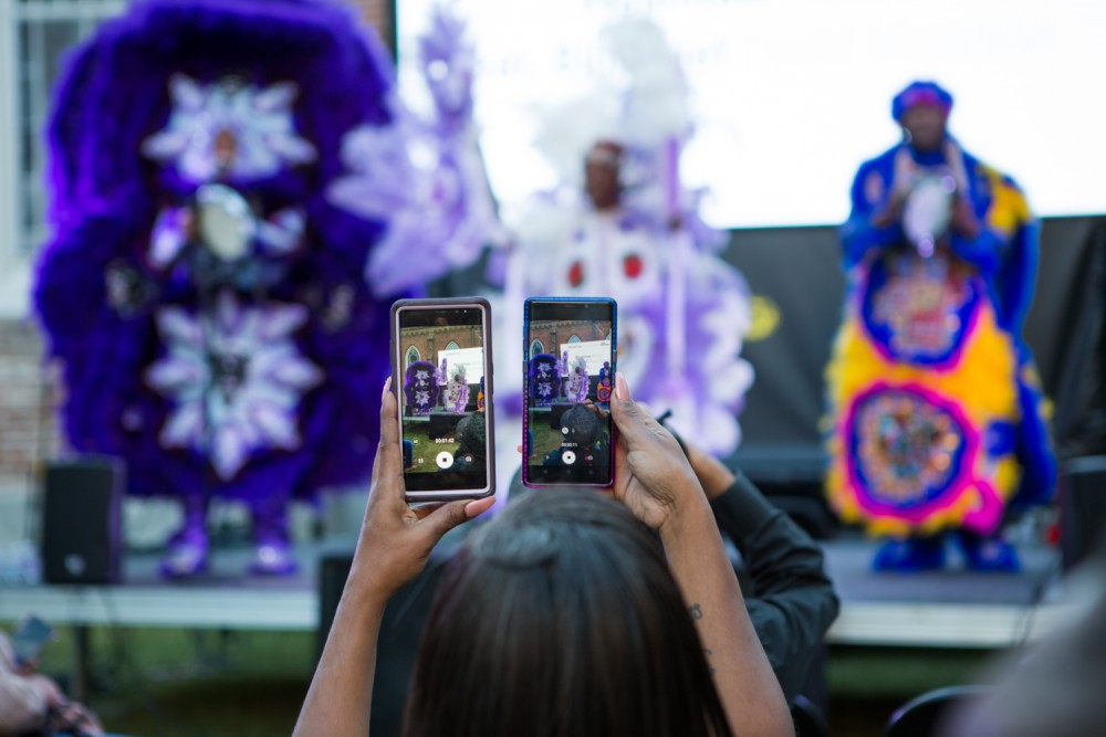 The luminaries who contributed included architects Marshall Brown as well as Ada Tolla and Giuseppe Lignano of LOT-EK, curator Gia Hamilton, filmmaker dream hampton, The Roots founding member Black Thought, and scholar and musician Beth Coleman, among many others. It was also a true festival. On and around the courtyard’s stage, there were performances by the children of Make Music NOLA and by the Washitaw Nation, who marched in their vibrant feathered costumes and got the whole yard moving. Stilt walkers (commissioned by Tulsa-based artist Crystal Z. Campbell) roamed about, performing in conversation with the Bell Artspace’s 19th-century architecture.