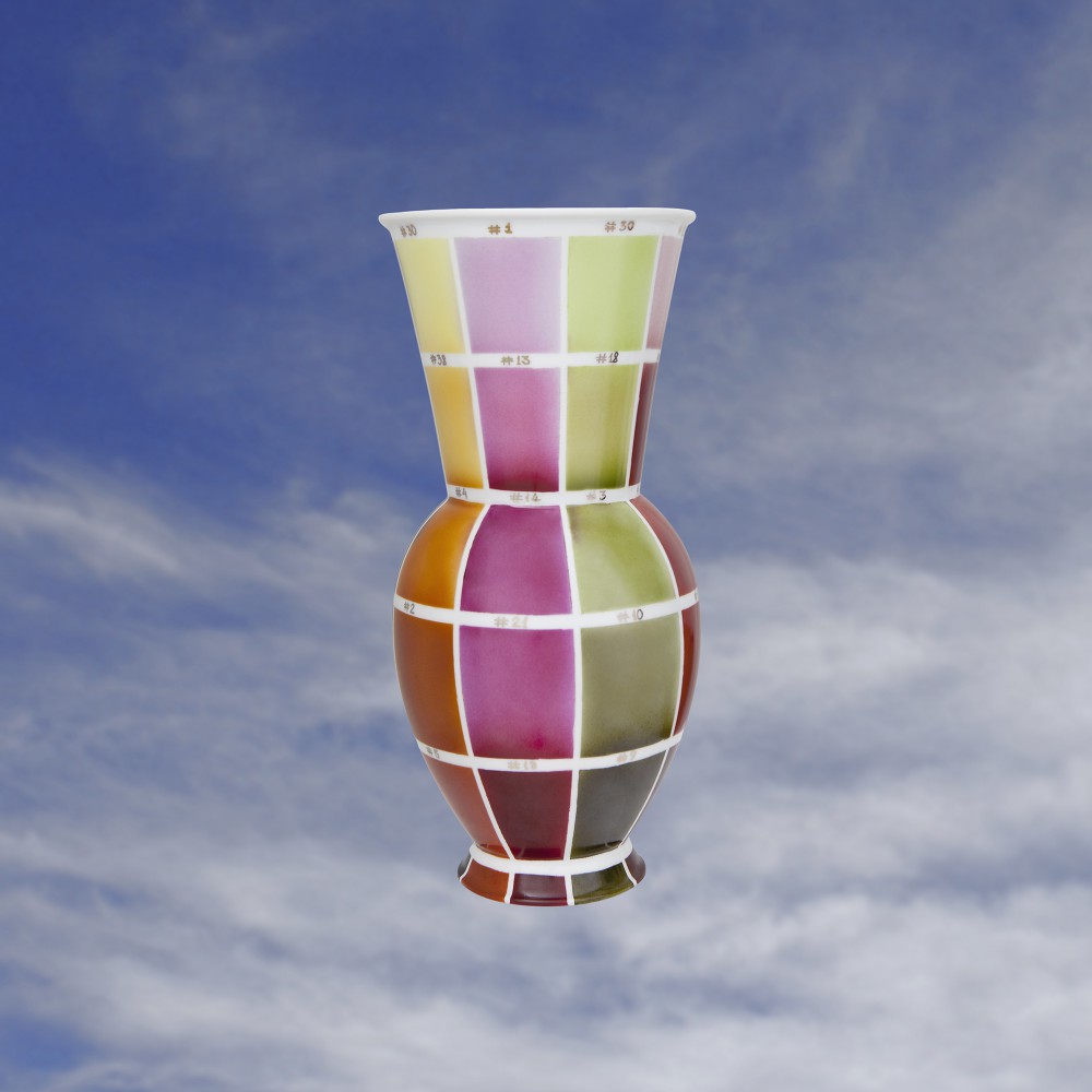 Equally at home with both painting and performance, Kerstin Brätsch moves fluidly between media. She found the inspiration for her Halle vase in the traditional technique of porcelain color sampling. “Each porcelain factory has its own shades and color samples, so it knows which paint reacts to which temperature,” she explained. “As a painter, I wanted to work with that medium in an exemplary way, but using the structure of the given medium of porcelain.” So she teamed up with a restorer for the painstaking task of transferring a precise grid of different-hued rectangles onto the vase. The hand-applied patchwork of tones, each coded with a silver identifying number, is both chromatically expressive and refreshingly whimsical.