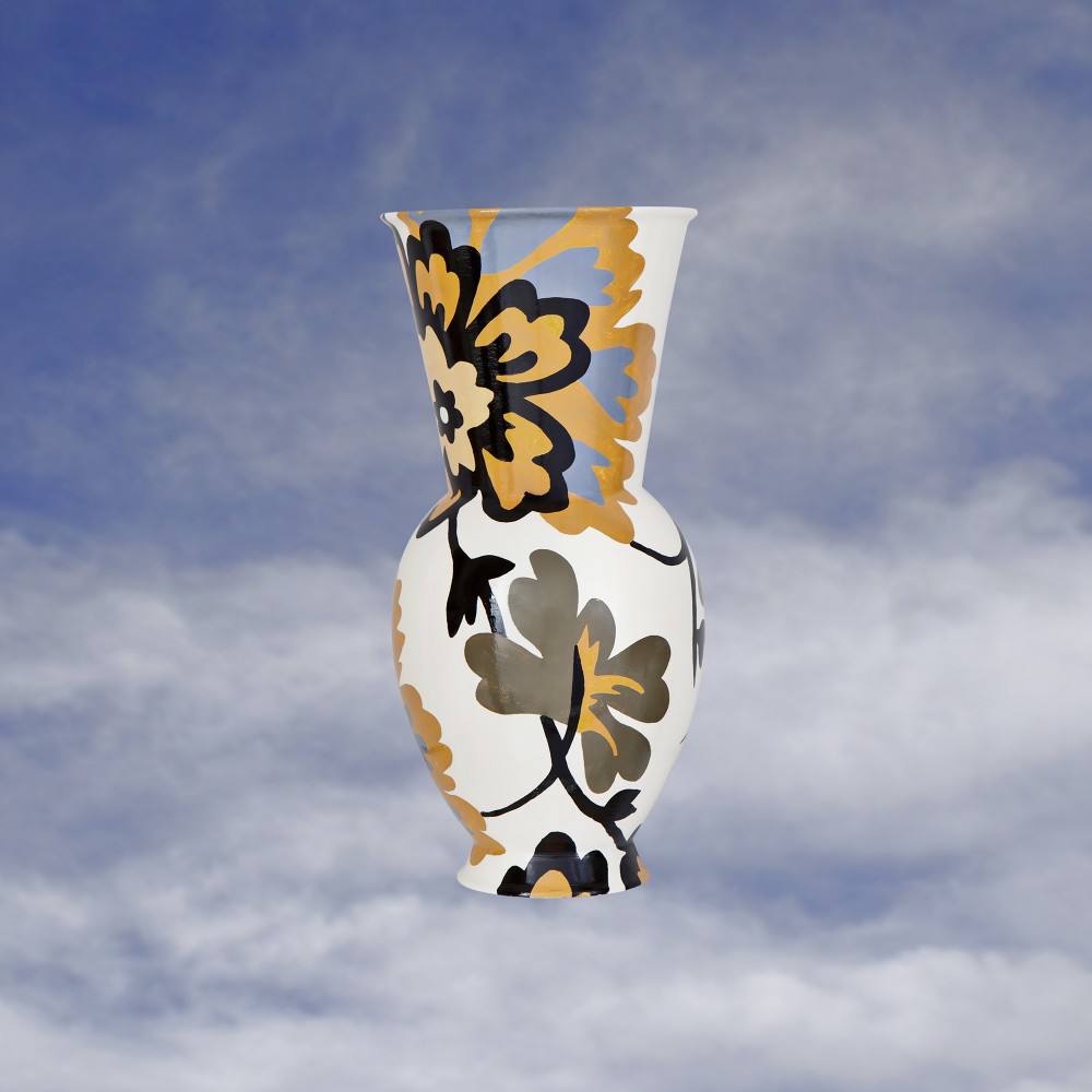 The floral pattern that adorns Mickalene Thomas’s Halle vase will be familiar to anyone who’s ever encountered her lush, textural portraits. The motif, which is based on a leftover remnant of upholstery from a couch that belonged to Thomas’s grandmother, frequently appears in the background of her canvases, and she knew immediately on receiving the vase that she wanted to apply the pattern to it. But the task was not as straightforward as one might think. Thomas set out to accentuate the vase’s silhouette, flattening its contours and “transforming the three-dimensional form into an image,” which required an adjustment in the scale of the familiar flowers. A joyful burst of blue and gold at the neck of the vase is set off by pristine white porcelain exposed throughout.