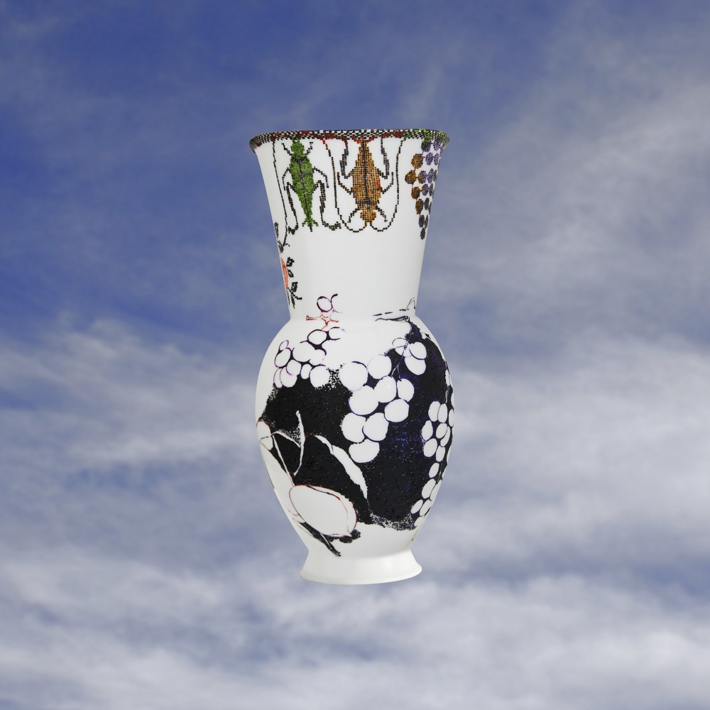 Adapting to the smooth porcelain curves of Friedlaender’s vase was second nature for Sabine Steinmair, who delights in rendering her delicate images and intricate motifs onto smooth surfaces. Steinmair typically works on glass or transparent methacrylate, though she’s just as comfortable with upholstery — in 2010, she embellished an Alvar Aalto armchair with intricate, multi-hued embroidery. Indeed, the artist is fascinated by “small detail, bits and pieces” and “ideas that can come from any visual field.” She used the stark white blankness of the Halle vase to craft a striking study in figure and ground: her plump grapes and delightful insects bring to mind both high Hellenic classicism and the irresistible haze of a late-summer afternoon.