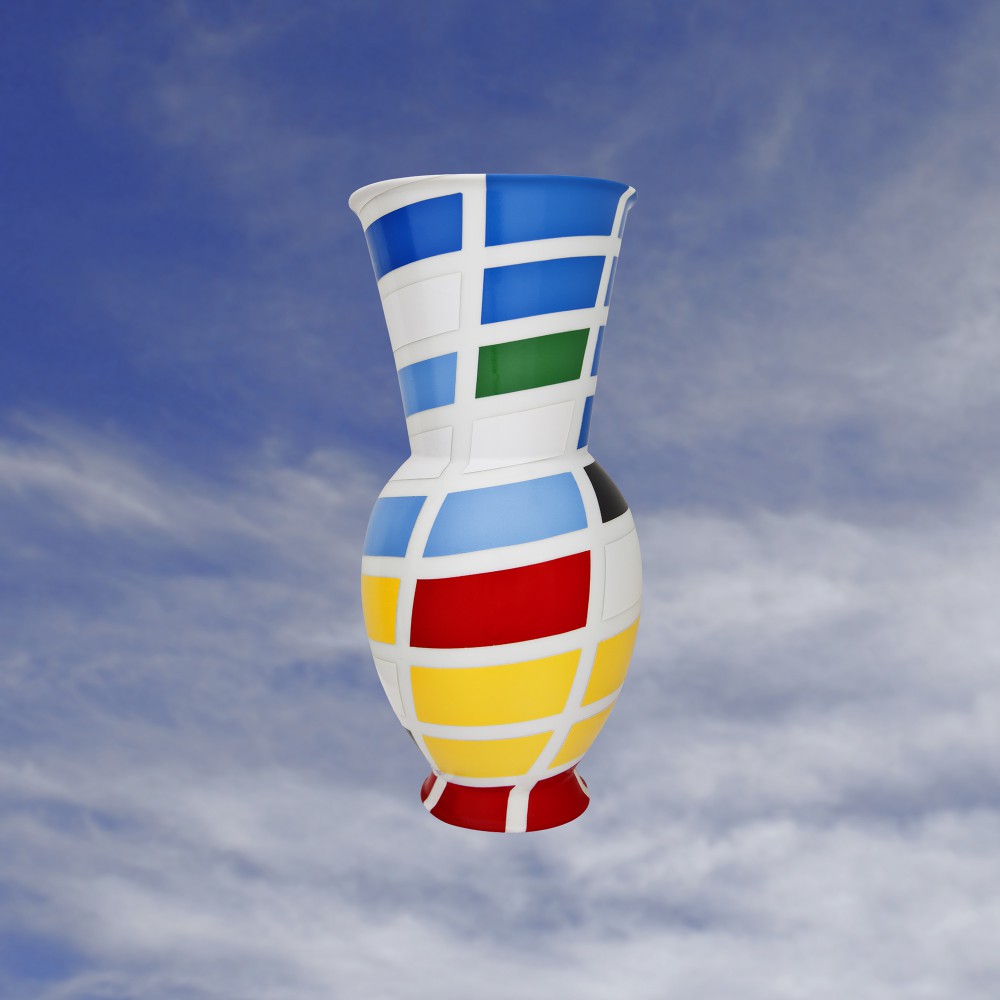 Sarah Morris’s ultra-flat, geometrically rigorous paintings adorn both public spaces and the lobby walls of some of the world’s biggest corporations. It’s a fitting duality for an artist whose work is explicitly concerned with exploring “the codes and power structures of architecture and cultural symbols,” as well as “the structures of control and global socio-political networks.” Morris decided to apply the contours of New York’s Condé Nast Building (Fox & Fowle, 1996–99) onto the Halle vase’s surface, creating a tension between the elongated rectilinear modules of the curtain-wall system and the supple platonic geometries of the vase’s profile. “The regularity of the painted surface provides no clear foreground or background, only surface, analogous to the building it depicts,” Morris explains.