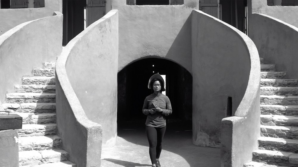 I was once again thinking about this idea of origin or provenance, and how we ascribe it to people and also to things. A lot of the video’s soundtrack is the soundtrack from Roots, the 1970s miniseries. I was thinking about stuff that’s complicated for me in terms of how we imagine Africa in the past, when it’s also a dynamic and evolving continent. So I went to a place called the House of Slaves on Gorée Island in Senegal. My father is Senegalese, and there’s a big history of African Americans going to Senegal to “go home.” That frames that space as a space of nostalgia when there are also real people living there in real time. I was interested in how the photos I’d seen of the House of Slaves were black and white — I think there’s even one by Carrie Mae Weems, at any rate she certainly went there — and then, when you arrive, it’s a super-cheery colorful space — salmon pink with aqua blue, yellow window blinds, and palm trees. So I was like, “Why, when we go back there, do we want to make it black and white, naming it a space of sorrow and not one of leisure?” Today it’s a vacation destination! And it wasn’t even a place where black people literally stepped out of a door and got onto slave ships — it was probably a rich slave trader’s house. Enslaved people definitely lived there, but we’ve created this really clear story about what that building is. There’s a door facing out onto the ocean that they call the Door of No Return. And Obama or Bush or the Pope would pose there and talk about how slavery was terrible, with Bush talking about it as though it’s terrible but resolved, and Obama at least admitting there are some ongoing effects. So when I got there, I walked up to the Door of No Return, and I was going to film myself kind of popping out of it, and I fell and sprained my ankle — the very first shoot! So while working on post-production I spent a lot of time trying to edit out the fact that I was limping. My ankle still hasn’t completely healed and might be wonky and messed up forever. And I think that’s really interesting — when I did that my ancestors were like, “We did not do that for you to do this.” (Laughs.)