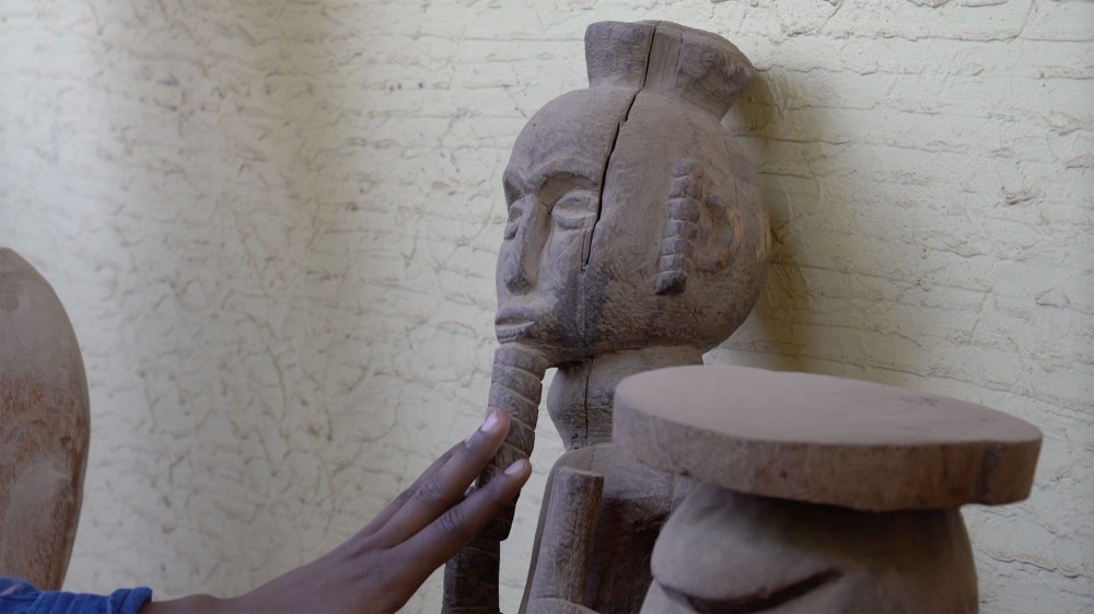 Around the same time they asked me to be in the biennial, Restoration Hardware opened up a store round the corner from the Whitney. I started going there every other weekend, looking around. I noticed African carvings and things like that on display in the showroom. I asked where they came from, and the employees were like, “Oh, our team members go out across the globe and find these one-of-a-kind objects and bring them back, and we share the ones that speak to our CEO. They’re not for sale.” I’d met this art historian named Kristina Wilson, who had been writing about the role that exactly these kinds of objects played in mid-century furniture showrooms. People talked about them in the same way — “They’re not for sale. They’re here to bring excitement.” Charles and Ray Eames went to Mexico and collected pre-Columbian art, and Wilson talked about how these pieces were almost there to reinforce the whiteness of the furniture, to say that it was sleek and could contain the wildness of these objects. So I was like, “Whoa, they were saying exactly the same thing that the person in Restoration Hardware was just saying.” That’s when I decided to make this video where you see a team member going out and finding these one-of-a-kind objects. When I went to Senegal, I went into this touristy restaurant that also sells carvings. I went into the bathroom and looked out the window and they had this dusty hallway that was full of tons of objects that looked identical to the ones in the store, all exactly the same. I guess maybe they had them outdoors, kind of aging them. And they let me shoot part of the video in there. Then I started thinking about the origins of objects and the origins of people. What if this explorer goes out thinking she’s gonna find this authentic object and it becomes confusing whether or not she’s finding her authentic self there? I thought of all the fraught crazy weirdness Alex Haley, the author of Roots, projected onto Africa. And so how am I projecting those things? I go and imagine I’m the African craftswoman making the tourist tchotchke that my explorer self then discovers.