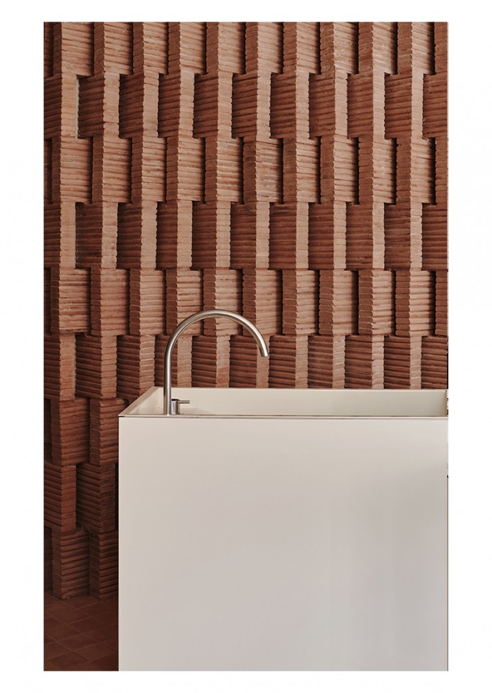 It was inspired by the local architecture, these patterns, this ordinance in the façades. It was almost like twisting the brick. We were using the same raw materials, but just offsetting them in little shifts so they would create a different rhythm. I always think of this type of texture as weaving. Kind of a binary combination: one on, one off. The result is a complex structure that plays with light, and as you move through, it changes, opens up.