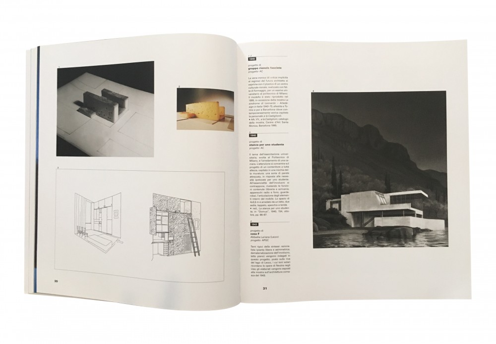 Clockwise from top left: Achille Castiglioni, Model for Fascist District Group (Gruppo Rionale Fascista) as a student at the Politecnico in Milan (1940); Achille and Pier Giacomo Castiglioni, Drawing for Casa F, Abbadia Lariana (Lecco) (1943); Achille Castiglioni, Room for a Student (1940).