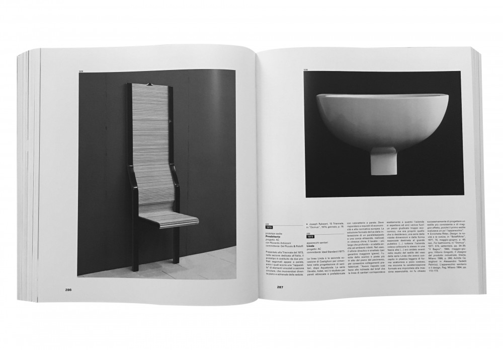 Left: Achille Castiglioni and Riccardo Arbizzoni, Presbiterio chair prototype (1973) for Del Piccolo & Ridolfi; Achille Castglioni, Linda bathroom fixtures (1973); Produced by Ideal Standard (1977).