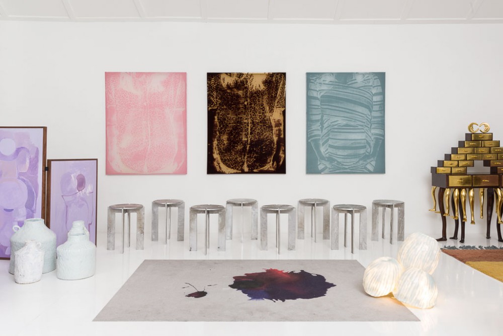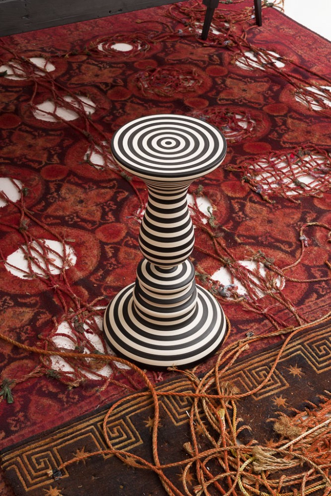ANNEX Winter 2018 installation: Greg Ito candlestick stool on Sophie Stone carpet. Photography by Ed Mumford. Courtesy of M+B Los Angeles.