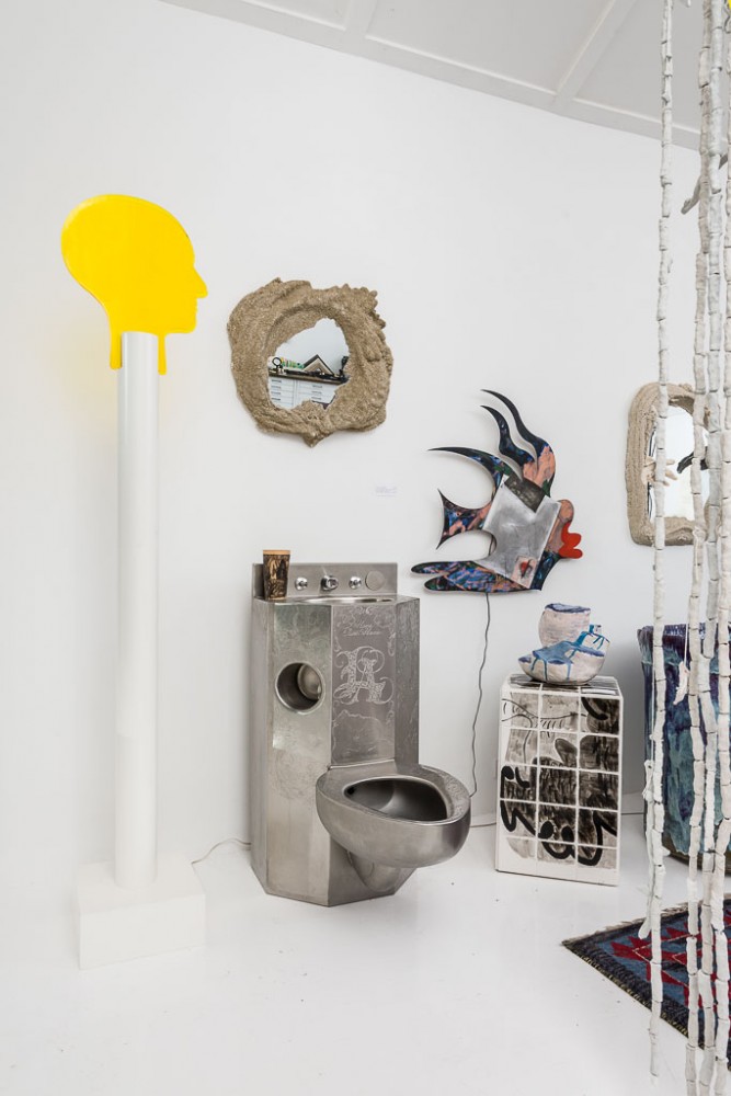 ANNEX winter 2018 installation, from left to right: Floor lamp by Nicolas L.; tattooed toilet by Art of the Unknown; sand mirror by Alison Veit; wall lamp by Tiziana La Melia; tiled stool by Lisa Jo; ceramic vase by Ben Wolf Noam; porcelain bead curtain by Brittany Mojo . Photography by Ed Mumford. Courtesy of M+B Los Angeles.