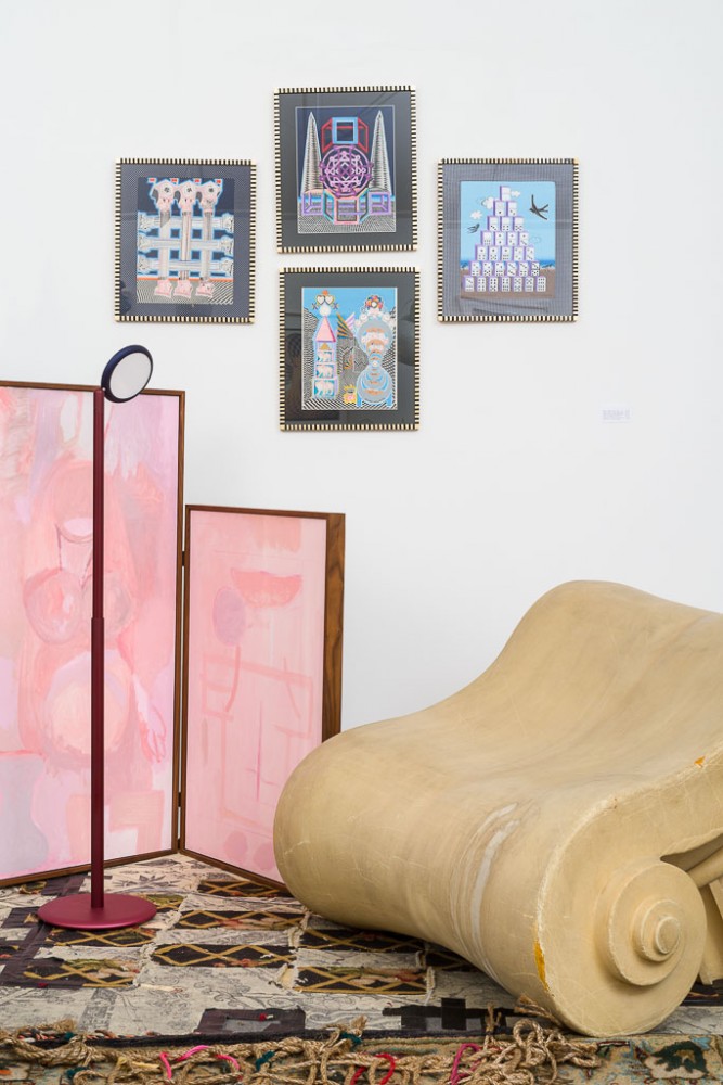 ANNEX Winter 2018 installation: Painted room divider by Alina Perkins; Parrot cordless floor lamp by Grau01; illustrations by Pedro Friedeberg; carpets by Sophie Stone, Capitello chair by Studio 65. Photography by Ed Mumford. Courtesy of M+B Los Angeles.