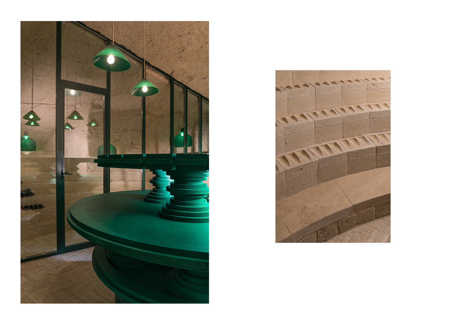 Well if you remember, the theme of the competition was “only whatever touches wine” — they had this idea that the only materials that could be used were those that come into contact with wine during the production process: wood, glass, cork, stainless steel, berglass, and so on. And here we were using stone — no one could imagine that wine could touch stone (even if historically stone troughs and presses were used for treading and squeezing grapes). All anyone could imagine was a bottle resting on wood. So we looked at various options in wood. But then we were a little bit stubborn at one point, and we insisted that it must touch the stone. But of course this isn’t usually how you treat a bottle (hits the stone wall). So we started carving a bottle-shaped form into the stone, in such a way that the bottle is cantilevered a little bit, and all of a sudden the stone began to seem gentle.