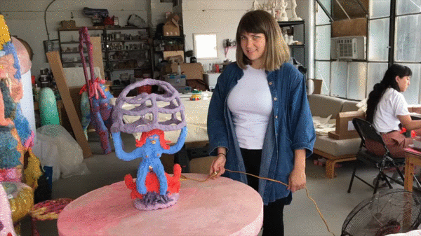 Designer Katie Stout posing with one of her "Girl" lamps. Photo by Antwan Duncan