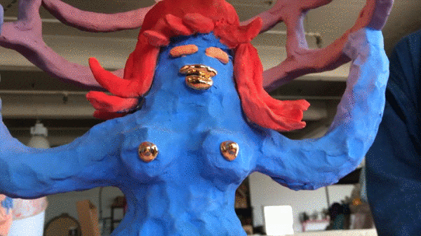 I guess the idea behind them is about how we always hear that girls are supposed to be a certain way. Of course they say, “there have been so many breakthroughs!” But I wanted to make these domestic objects, a lamp where the girls are sort of mischievous, as if they are totally misbehaving and distracted from their task. They’re naked, and there is just no one way to be in a domestic environment for them. I started looking at Allen Jones’s sculptures (which depict women transformed into items of furniture) and I thought “fuck you!” So, I’m making a wicker (girl) chair, and a (girl) bench. A guy in Mexico is fabricating them for me — he usually makes animals. And some of my lamps are a nod to (my) past (work), the older ceramic lamps, but bigger. I also made two lamps that have planters. I am also making curtains with girls embroidered on them. The whole show is earthier and more playful than my previous work.