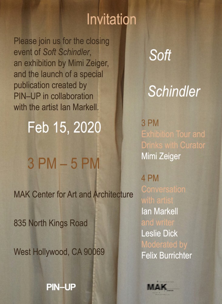 On the occasion of Soft Schindler, a design show curated by Mimi Zeiger, PIN–UP invited artist Ian Markell and writers Leslie Dick and Susan Orleans to reflect on the exhibition as well as the history of the landmark Schindler House. We are celebrating this catalog launch with a conversation between Markell and Dick moderated by PIN–UP founder Felix Burrichter at the MAK Center West Hollywood on February 15.