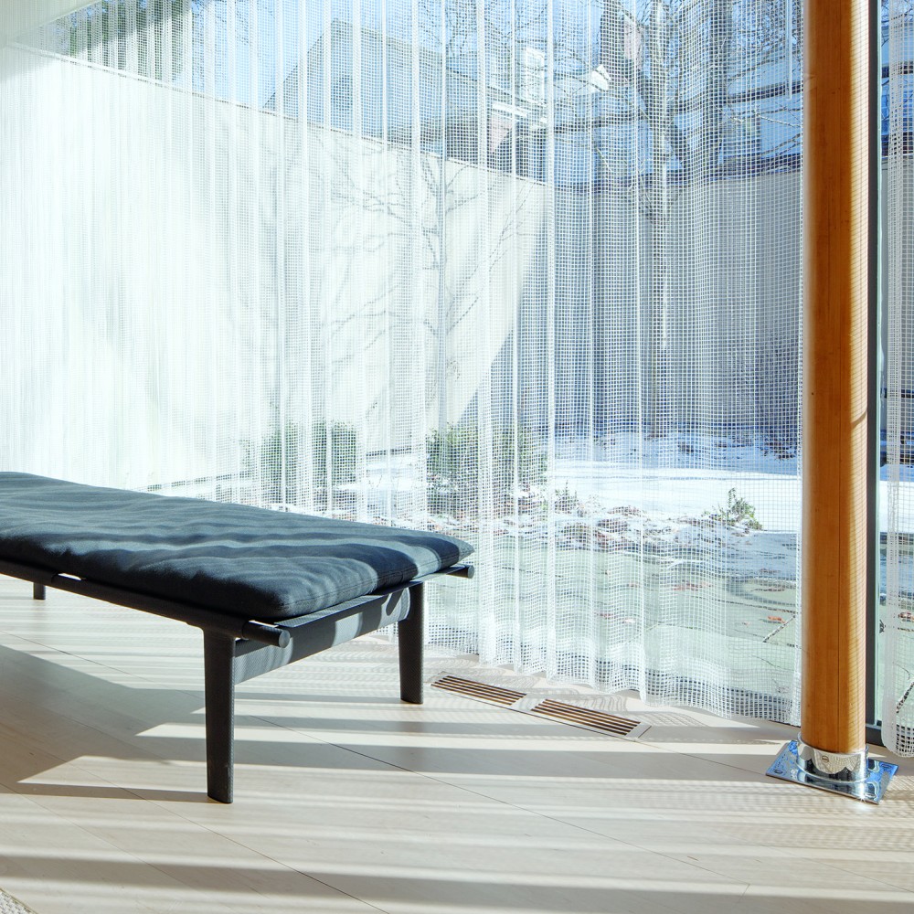 My Twill Weave collection for Kvadrat developed out of a chain of interests. First came the Thesis House project, which offered the opportunity to create a piece of furniture. Upon diving in, I realized the biggest piece of furniture in Johnson’s original layout was Mies van der Rohe’s daydbed. So I chose to do a day bed. But how and why? For me, the most interesting piece of the house was the columns because, it’s a Miesian house, but Mies built with steel columns, and because of the shortage in World War II, Johnson had to work with wood columns. But the fact that they’re wood was not as interesting to me as the fact that they’re made by mast-makers. So, that’s who I wanted to work with. Except mast makers today don’t use wood. If this had been 20 years ago they might have been using aluminum, but now they use composites, and so we chose to work with carbon fiber. I visited one of the greatest mast makers in New England, where I chose three profiles from a graveyard of mandrels: foil shapes, tapered foil shapes, and circular tube. Using a flexible three-millimeter sheet for the seat, and rigid tubes for the structure, we were able to engineer an object with many performance characteristics that is visually homogenous. The epoxy that binds the cloth is matte-finished, which leaves the cloth’s texture visible and tactile.