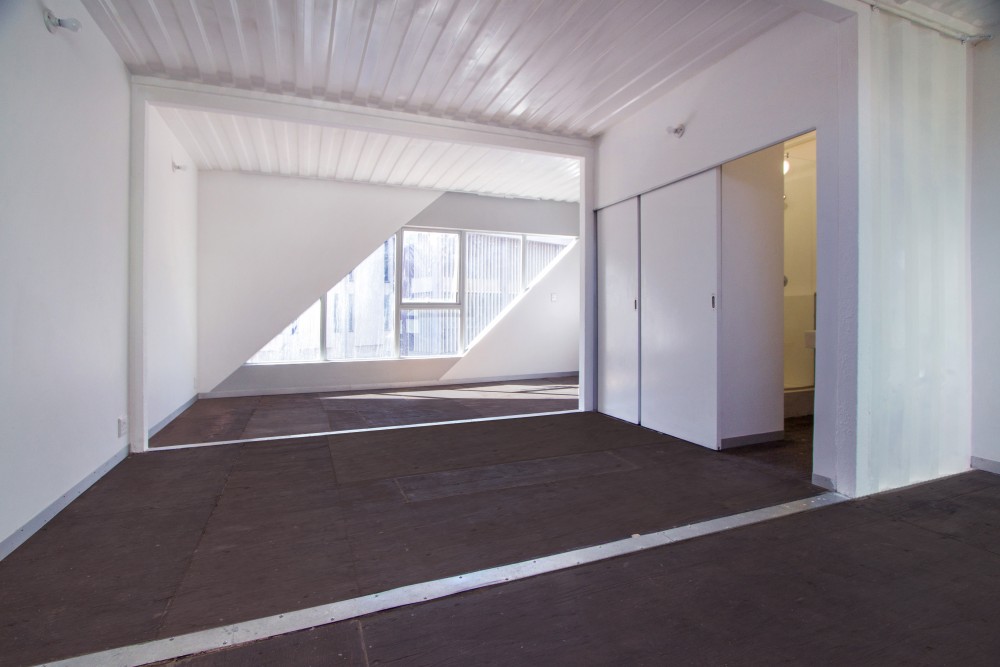 Drivelines (named after the car-repair shop that used to stand on the property) introduces low-cost residential options to an area already housing hip restaurants, bars, and the popular weekly Market on Main. “We loved the idea of being part of the change in this city,” Tolla enthuses. The building was complex, she says, because of its wedge-shaped plot of land which informed the hinge-like V plan of the two wings, which in turn resulted in a central courtyard with a swimming pool for residents. “The building is on a busy road, so this (triangle) created an inner space that’s protected, safe, and open. Maboneng is an opportunity for people to re-engage with the city, so we didn’t want the building to be completely closed,” Tolla explains with respect to the open end of the V that looks out onto Johannesburg. “When you’re in there it feels protected but it doesn’t feel like you’re walled in. The city is all around you, and you see it all the time.” The views out of the structure are augmented by large windows — diagonal insets cut into the containers, creating a graphic exterior of diamonds and Xs. “We worked with the diagonal rather than the perpendicular,” she explains of the two slanted glass forms that were replicated multiple times. The pattern is mimicked on the opposite end of each container, allowing sunlight and fresh air to stream into every apartment from both ends. “You have natural light for most of the day and don’t need air-conditioning.”