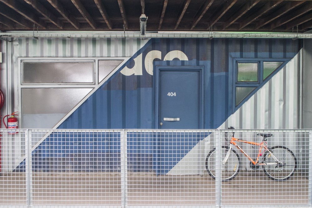 Seven floors of stacked shipping containers make up the two connected buildings.