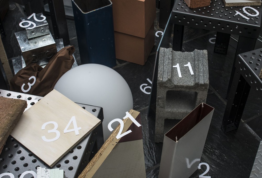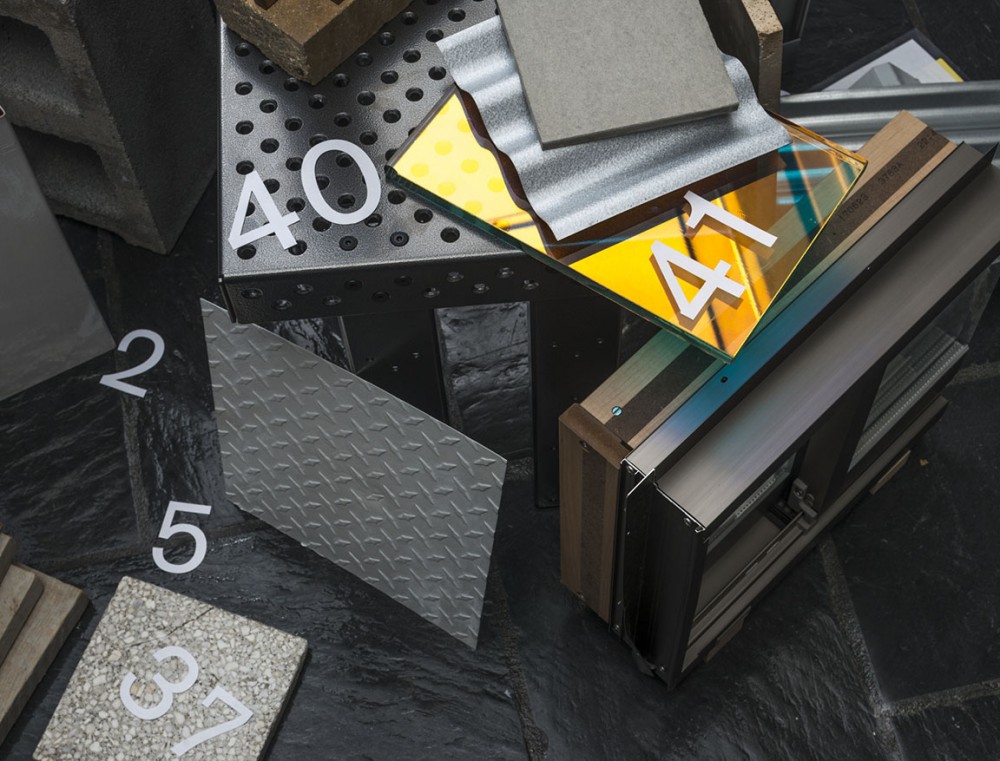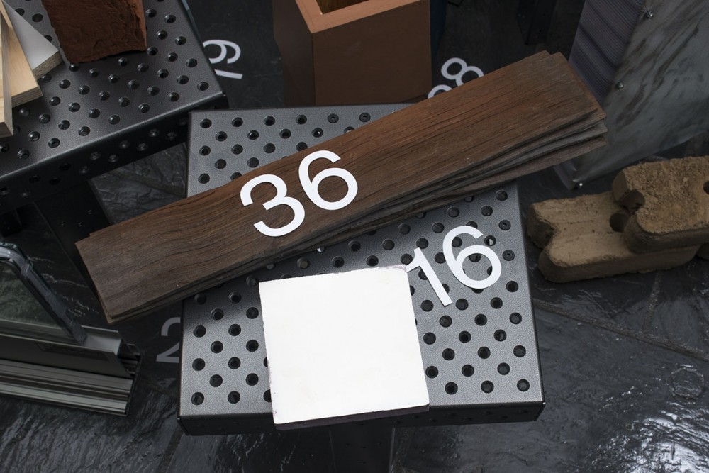 Concrete blocks, acrylic sheets, and perforated aluminum among other material samples, were collected from each of the 44 offices and placed outside the mail gallery.