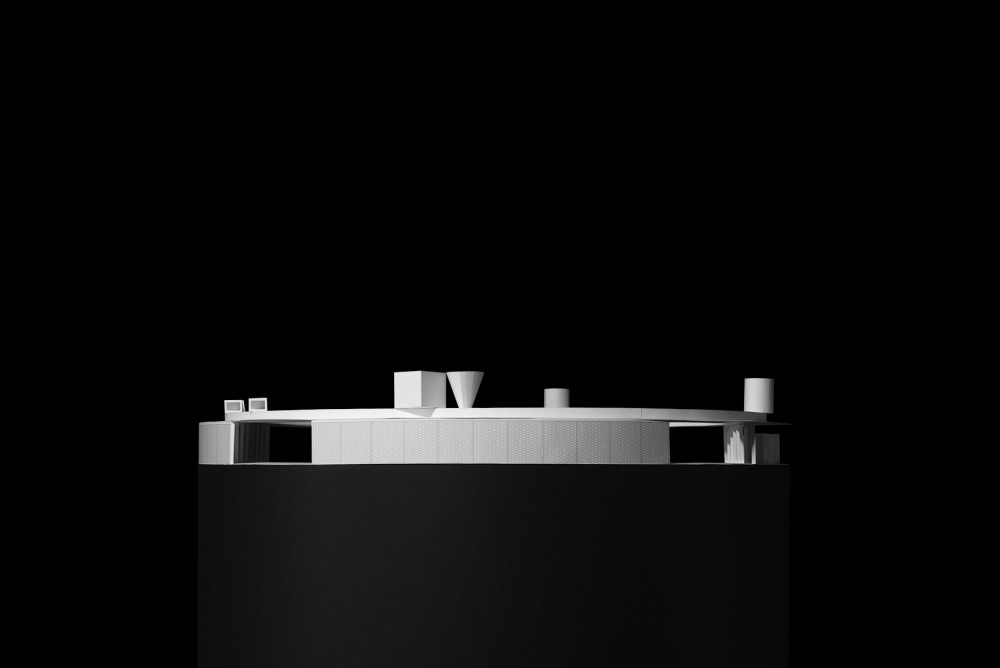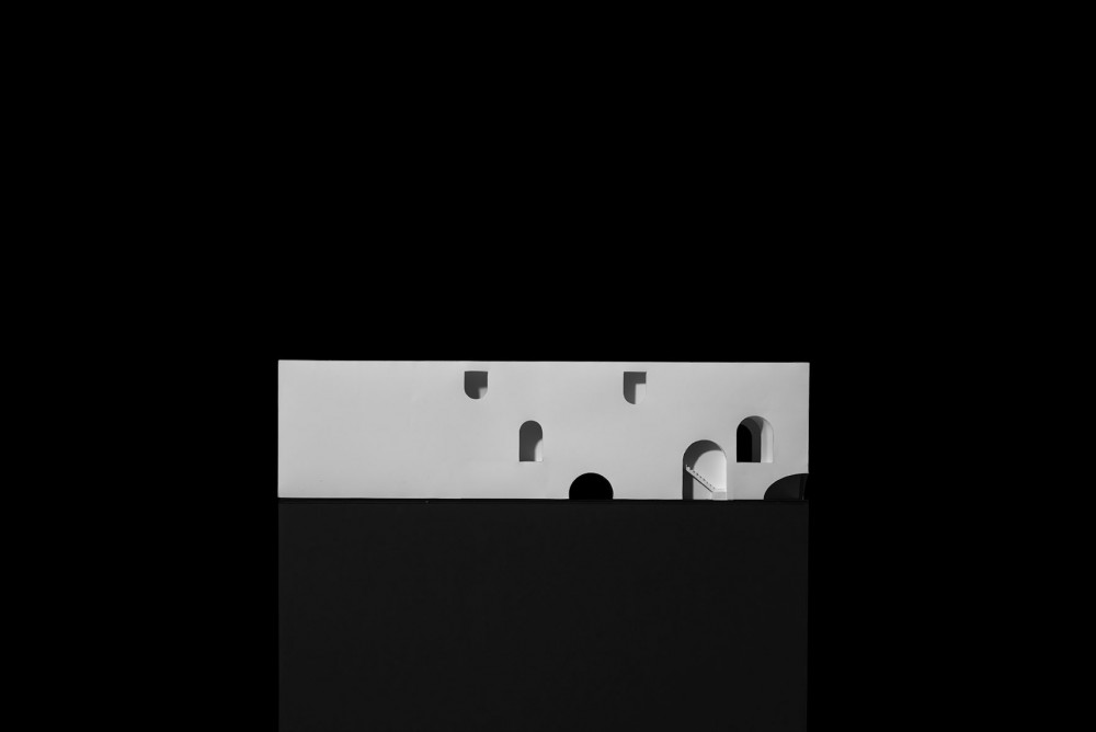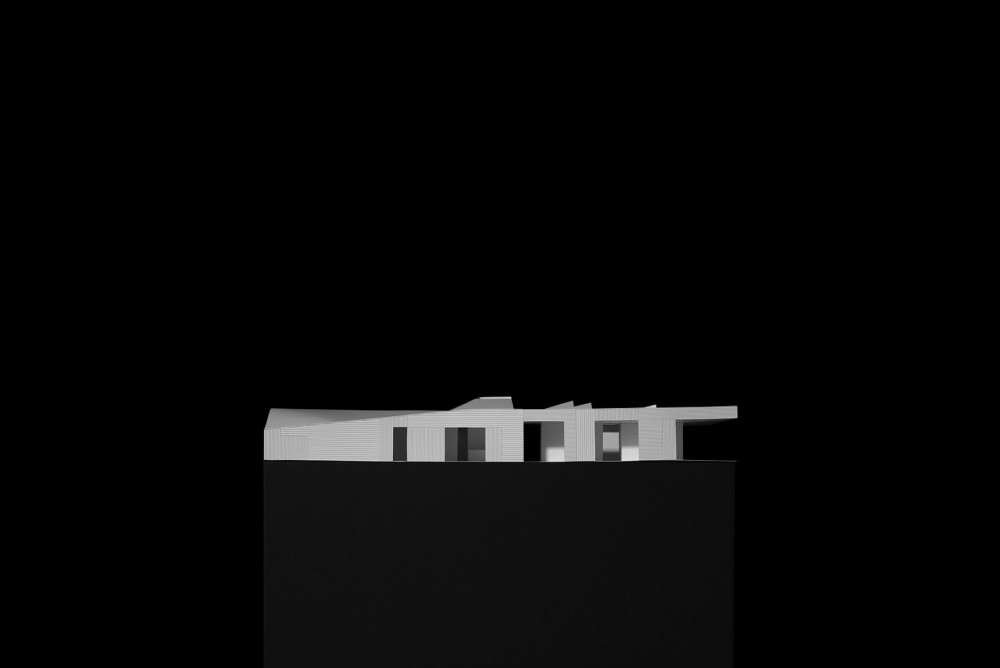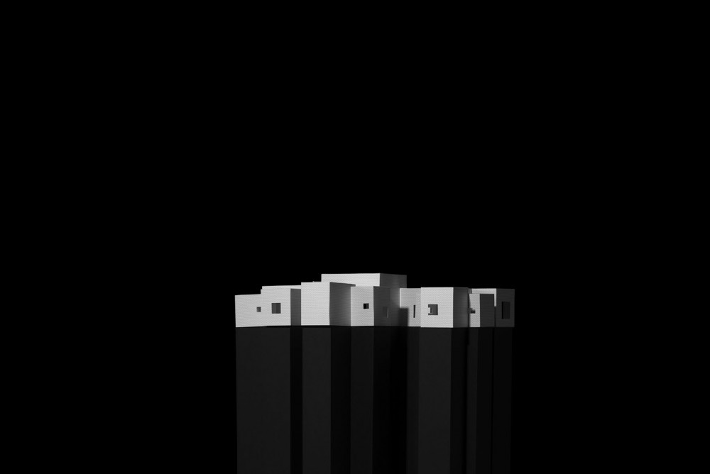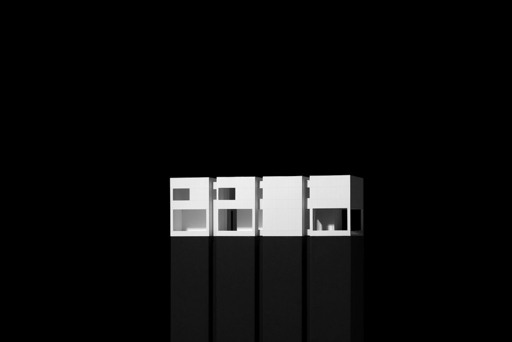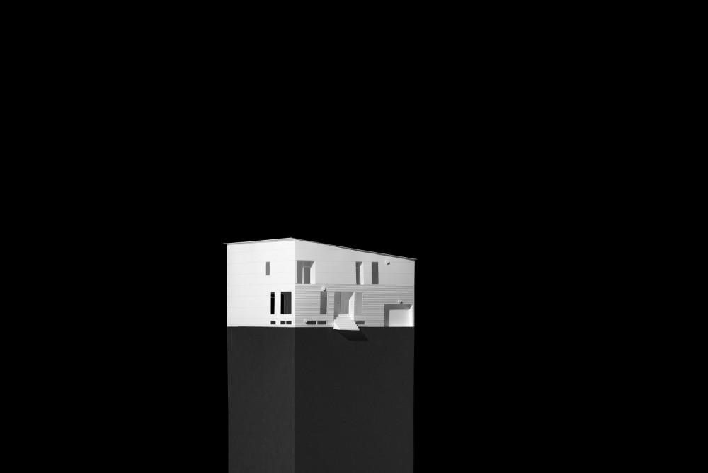 Illuminated and raised on black plinths, the model houses seem to float in space as autonomous characters: one white collection of shapes, a mass amassed. The white edges of the models stand out crisply against the black backdrop. All models were made with the same technique: 100lb Bristol paper, cut, scored, folded and decorated with material hatches – producing the blinding effect of equivalence. A method that encourages comparison without representational distraction.