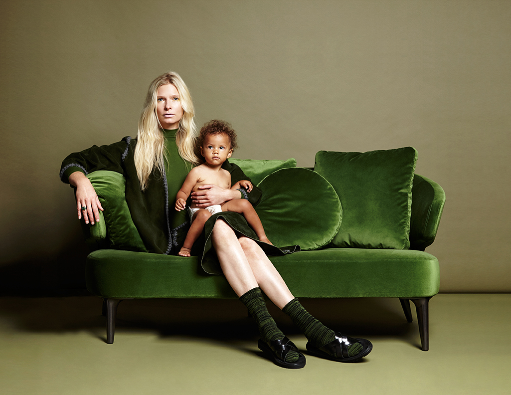 Here Christina is seen lounging with little Yve Maximo on the Aston sofa in a perfect symphony of restful greens. The Aston, with its lush meadow-green velvet upholstery and pewter-colored cast-aluminum legs, was designed by Rodolfo Dordoni for MINOTTI and is available through DDC. Christina’s skirt and matching jacket are by A DÉTACHER, the leotard is by WE LOVE COLORS, the sandals by OAK, the socks by HUE, and the ring by VARIANCE.