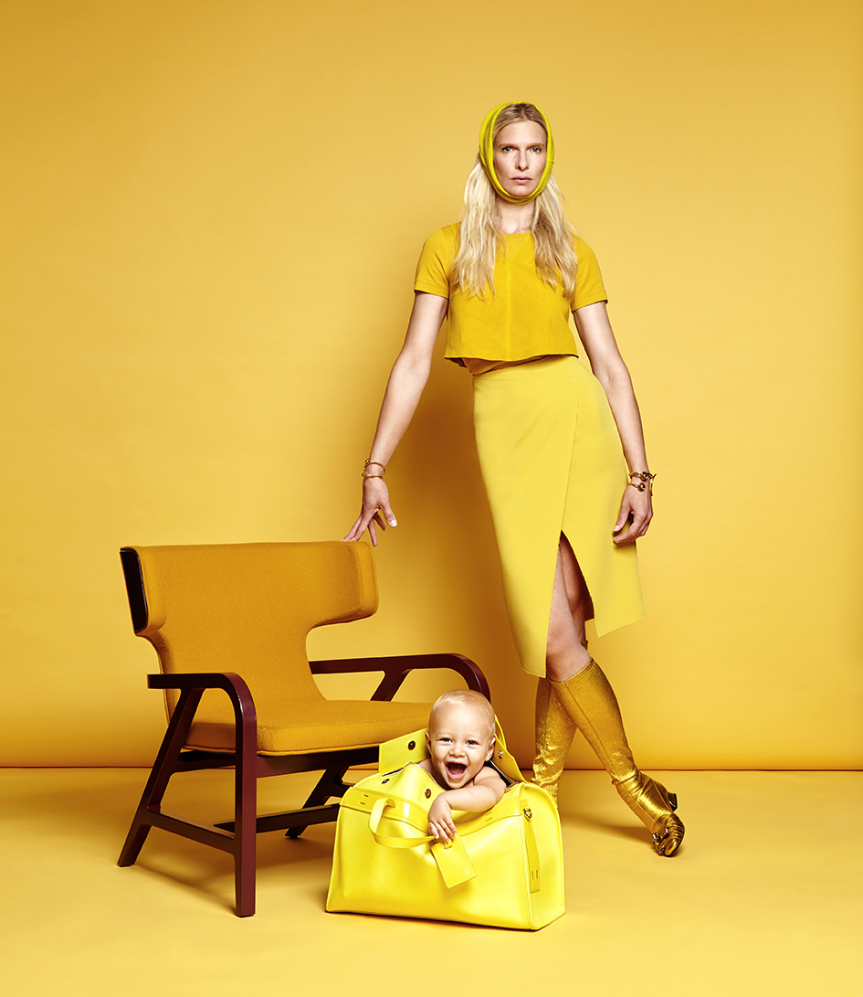Known for communicating happiness and capturing the joy of sunshine, a yellow environment is the perfect stomping ground for a little bundle of joy like Malcolm Radboy. Christina takes a backseat to his antics while leaning on the Fulgens, a modern lounge chair designed by Antonio Citterio with a wooden frame shellacked in burgundy and upholstered in a striking saffron-colored wool. It is available through the MAXALTO collection at B&B ITALIA. Malcolm’s Dakota leather bike bag is by KENZO, Christina’s T-shirt is by MARYAM NASSIR ZADEH, the suede vest and skirt are by TOPSHOP, and the dramatic gold buckle boots are by BOTTEGA VENETA. Christina’s bracelet is by RENVI and the cuff is by MARY PING X PIÈCE À CONVICTION.