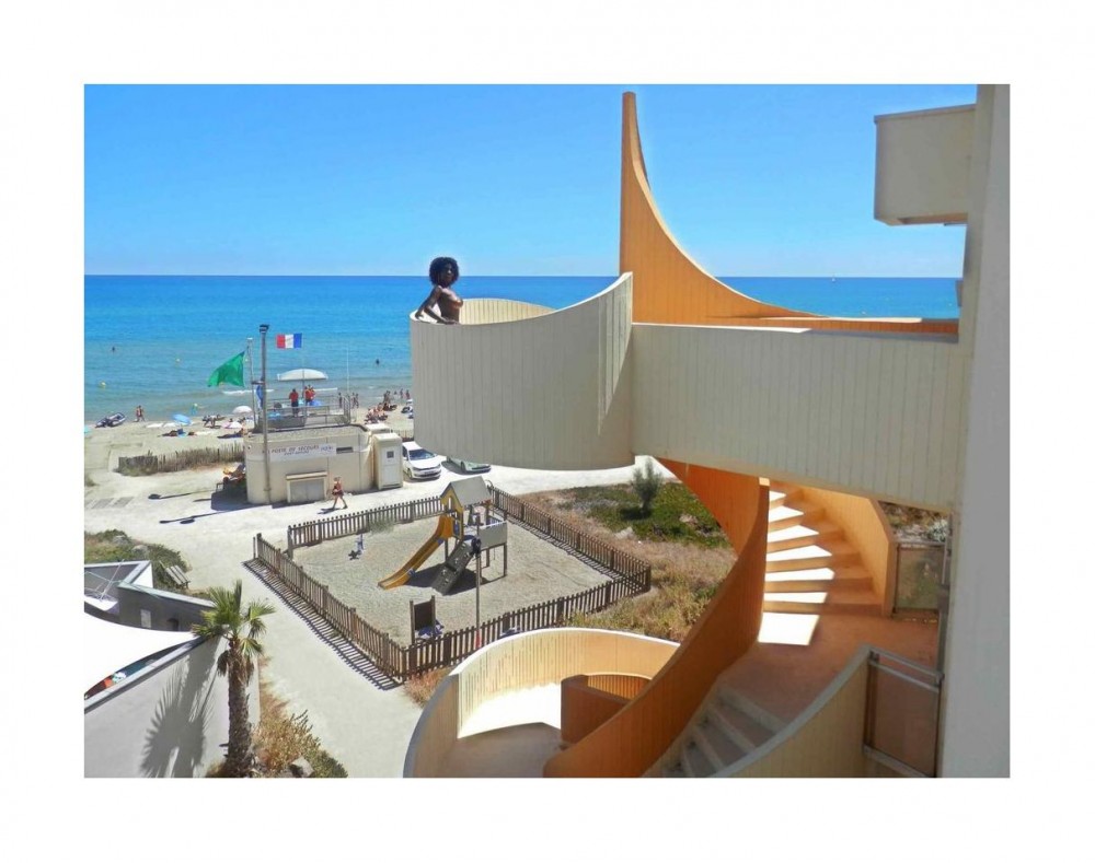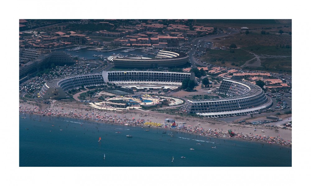 Although France’s first city of the sun spawned no architecture of note, it lent its name to part of another nudist colony that did: the village naturiste at Cap d’Agde, which has been the largest in the world for the last several decades. At Cap d’Agde, Héliopolis is the name of the village’s most monumental building: designed by local architect François Lopez in 1975, it takes the form of a four-story, 3,000 foot-diameter, horseshoe-shaped residential block which opens onto the beach, its façade angled so that each apartment receives maximum sun exposure. At the center of this Modernist panopticon-colosseum for nude living are a bar (Le Bangkok), a restaurant (La Moule d’un Soir), and a nightclub (Le Glamour Beach), as well as a private pink-tiled pool club (Le Jardin d’Eden), which today all cater to swingers. The Héliopolis building in Cap d’Agde is the unexpected result of two visions of holiday resorts: naturist idealism and state-led vacation urbanism. Cap d’Agde is one of seven mass-tourism beach resorts planned by General de Gaulle’s government in the 1960s on the coast of Languedoc-Roussillon, between the Rhône delta (Camargue) and the Spanish border. Known as the “Mission Racine,” after its director, Pierre Racine, it remains one of the largest postwar infrastructure projects undertaken in France, with facilities for half a million holiday-goers having been constructed between 1963 and 1983 in inhospitable mosquito-infested marshes (15 percent of the overall budget was allocated to eradicating mosquitos).
