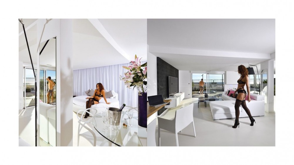 It was in this context that brothers Paul and René Oltra transformed the naturist campsite they had founded in 1956 into a giant beach resort. They employed Lopez — who was working alongside Jean Le Couteur, Cap d’Agde’s architect in chief — to help them build the largest naturist colony in the world, centered around three massive concrete buildings located away from the textiles (naturist jargon for people who wear clothes) behind gates, a harbor, and dunes. Between 40,000 and 50,000 naturists gather there each summer, half of them in Modernist architecture (Héliopolis alone can accommodate 5,000), half of them in camping bungalows. The 1970s and 80s were the golden age of Cap d’Agde’s naturist colony. It was championed by the local authorities because of its profitability and dominated by a rather chaste family naturism. But, by the early 90s, sex had become the resort’s main raison d’être: the clubs now welcome swingers, shops sell kinky gear among the groceries, and the beach is home to an internationally famous summer-long orgy that reaches its apogee in the dunes of the Baie des Cochons (Pigs’ Bay), with endless open-air group sex and bukkake. Several pages are devoted to Cap d’Agde’s late-modern condition in Michel Houellebecq’s 1998 novel Atomised, which describes the architecture, the clubs, the sex, and the fortuitous geography of the site as “an idyllic phalanstery out of Fourier.”