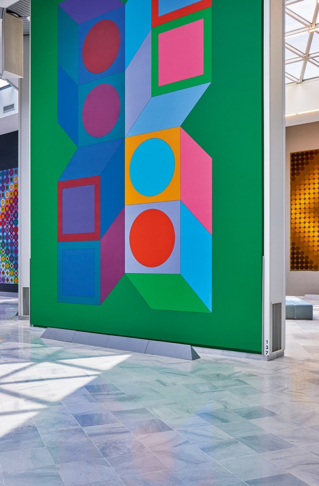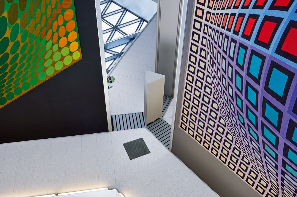 Like one of Vasarely’s artworks extruded into three dimensions, the building is generated from a cellular, hexagonal plan, each chamber of this utopian honeycomb being top lit and filled with “Intégrations,” as he baptized the large-scale architecture-integrated artworks it contains. In the manner of a billboard, the Fondation’s exterior, with its boldly geometrical black-and-white aluminum panels, announces what’s to come, but does nothing to prepare the visitor for the shock of color inside. Nor for the variety of materials, canvas, ceramic, metal, and even fabric being used to monumental effect in an immersive total environment of optical overload.