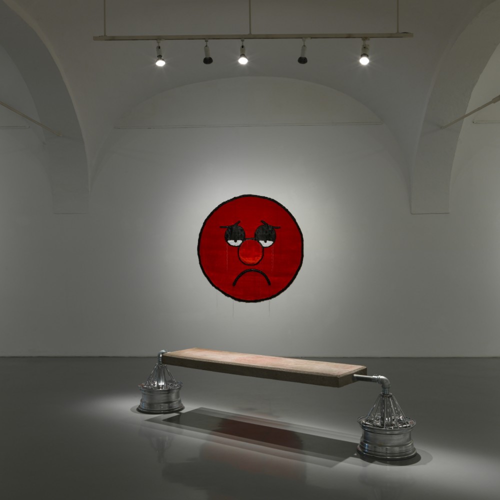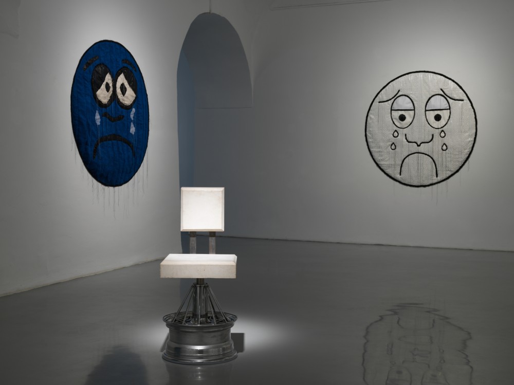 The works and artists included in the biennial span generations, centuries, and cultures, resulting in surprising and sometimes haunting juxtapositions. The precocious millennial Nigerian-American designer and artist Dozie Kanu’s badass Bench on 84’s (2017) is joined by more recent work commissioned for the biennial. With his slightly-taller-than-standard film director’s seat, Chair (xiii) (Stand Up)(Ja Rule) (2019), Kanu uses scale to comment on power dynamics in the creative industries, the piece accompanied by handcuffs and two smaller foot stools, respectively Scrool (Ur Boy Bangs) and Scrool (Supahead) (both 2019), their canvas seats printed with illustrations of black figures, stereotypes of performers from the 19th century to today. In a move of curatorial heft, these furniture pieces are surrounded by L.A.-based artist Amanda Ross-Ho’s Hurts Worst series (2018–19), large sequined wall works depicting cartoonish faces in agony culled from the widely used medical-symbol system for communicating pain levels, their emoji-like simplicity at once belying and evoking the complexities of collective contemporary distress, the specifics of which Kanu teases out. The combined effect is somehow cathartic, hopeful even — once again a mix of sour and sweet.