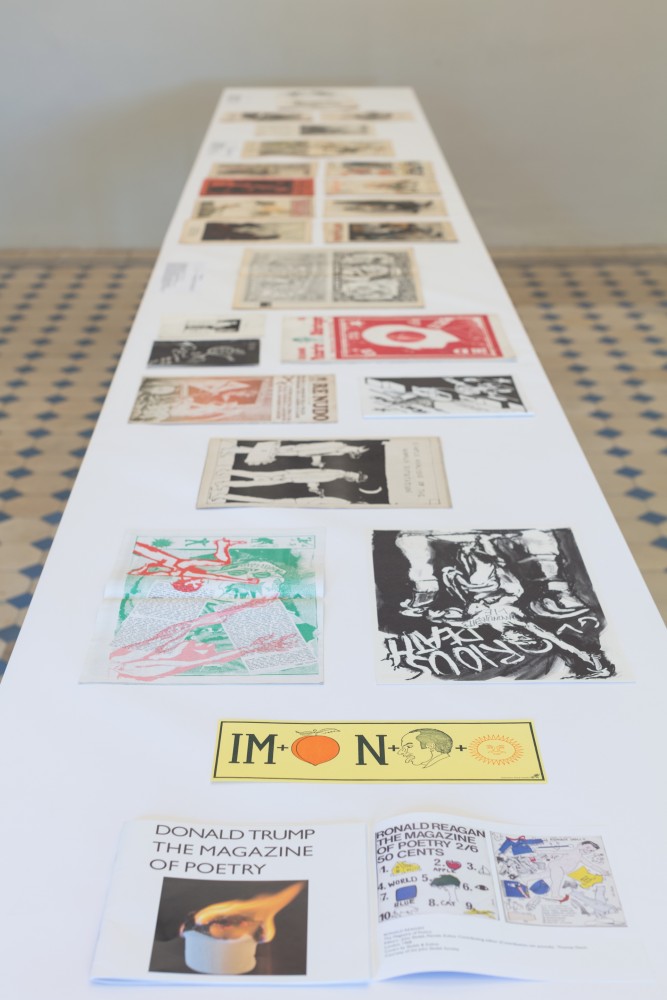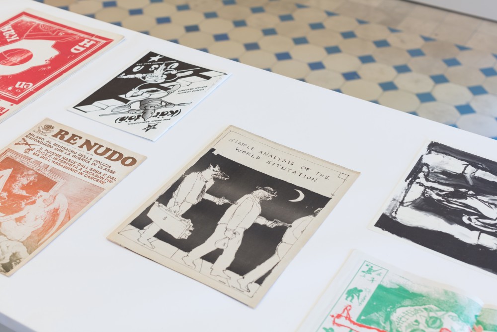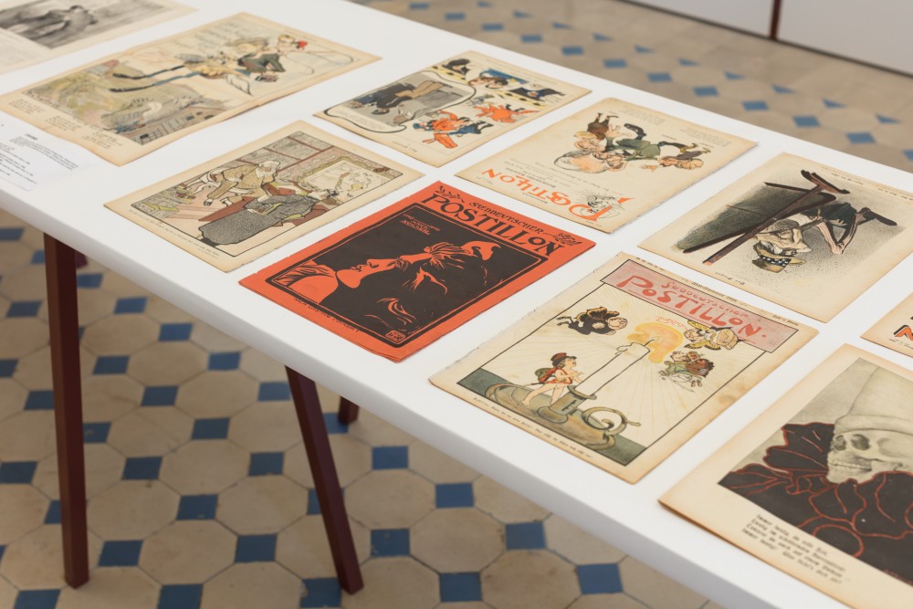 Satire is a loose theme organizing the selections, underscoring the political and pleasurable potential of humor simultaneously to disguise and reveal bitter truths. No More Fuchs Left to Give, a polemical reading-room installation by rare-books dealer Arthur Fournier and comparative-literature scholar Raphael Koenig, presents lithographs and satirical cartoons by German book collector, art historian, and Marxist activist Eduard Fuchs (1870–1940), the meme-equivalents of the late-19th and early-20th centuries. Archival prints of these politically-charged comics are displayed alongside contemporary copies cheaply printed on canvas bought from walmart.com, their frugality evoking dorm-room decorations. The contrast between the copy and the original forces the viewer to confront how the medium influences the message’s power, as well as the proliferation of political imagery in the age of infinite reproducibility — a provocation that may offer us clues for dealing with present-day meme-ified culture.