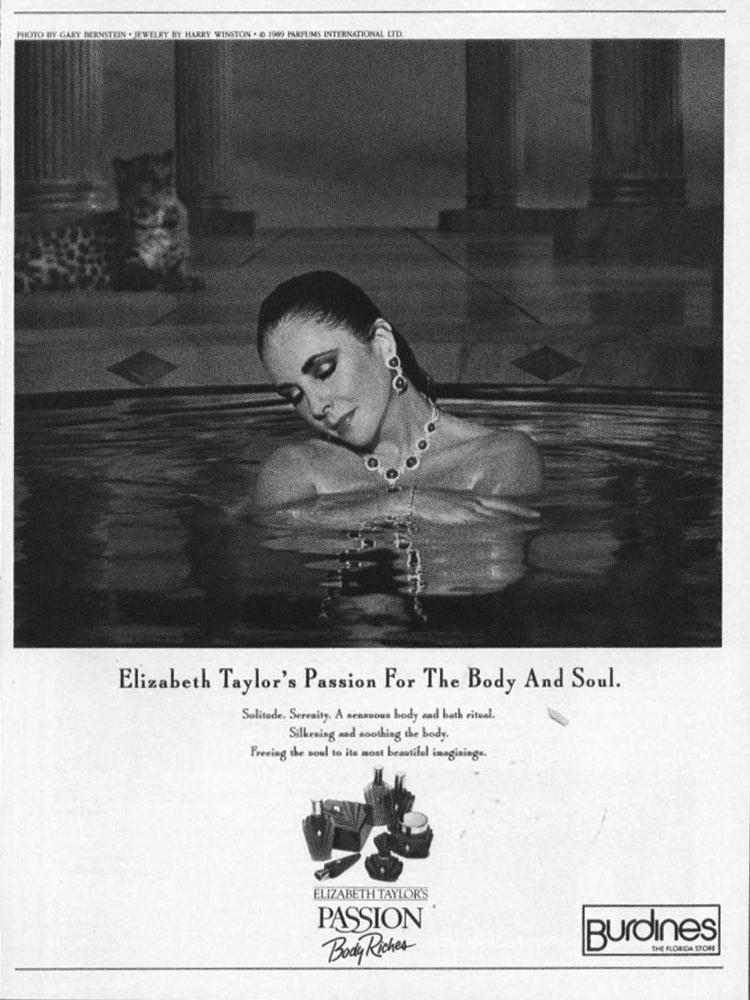 Advertising for Elizabeth Taylor’s perfume Passion, c. 1988.