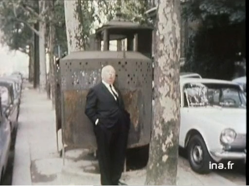 Alfred Hitchcock on French television in the 1960s in front of a vespasienne.