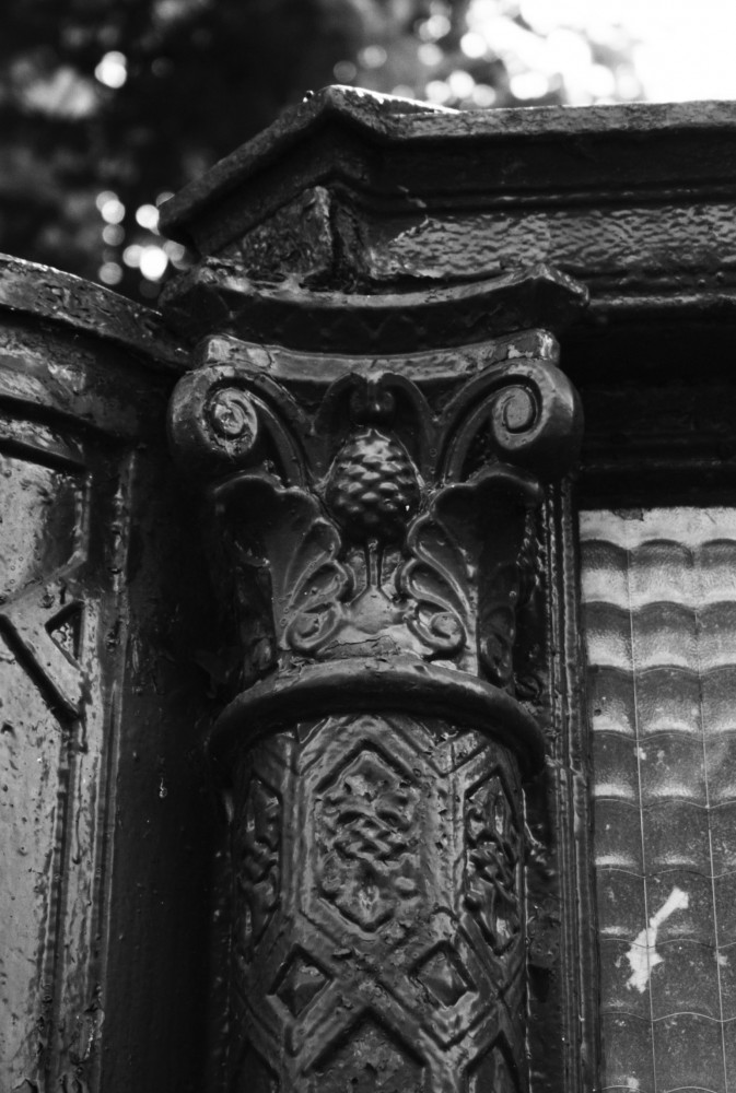 A column detail of the pissotière on Boulevard Arago, Paris.