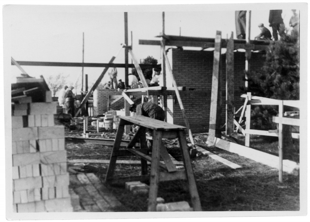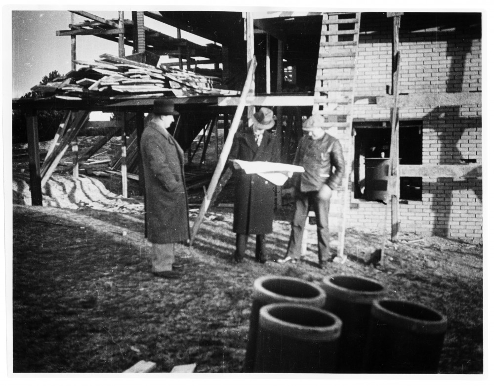 Architect Sigurd Lewerentz (center) in conversation with workers on site. Photographer unknown (1935). Sigurd Lewerentz Collection; ArkDes Stockholm.